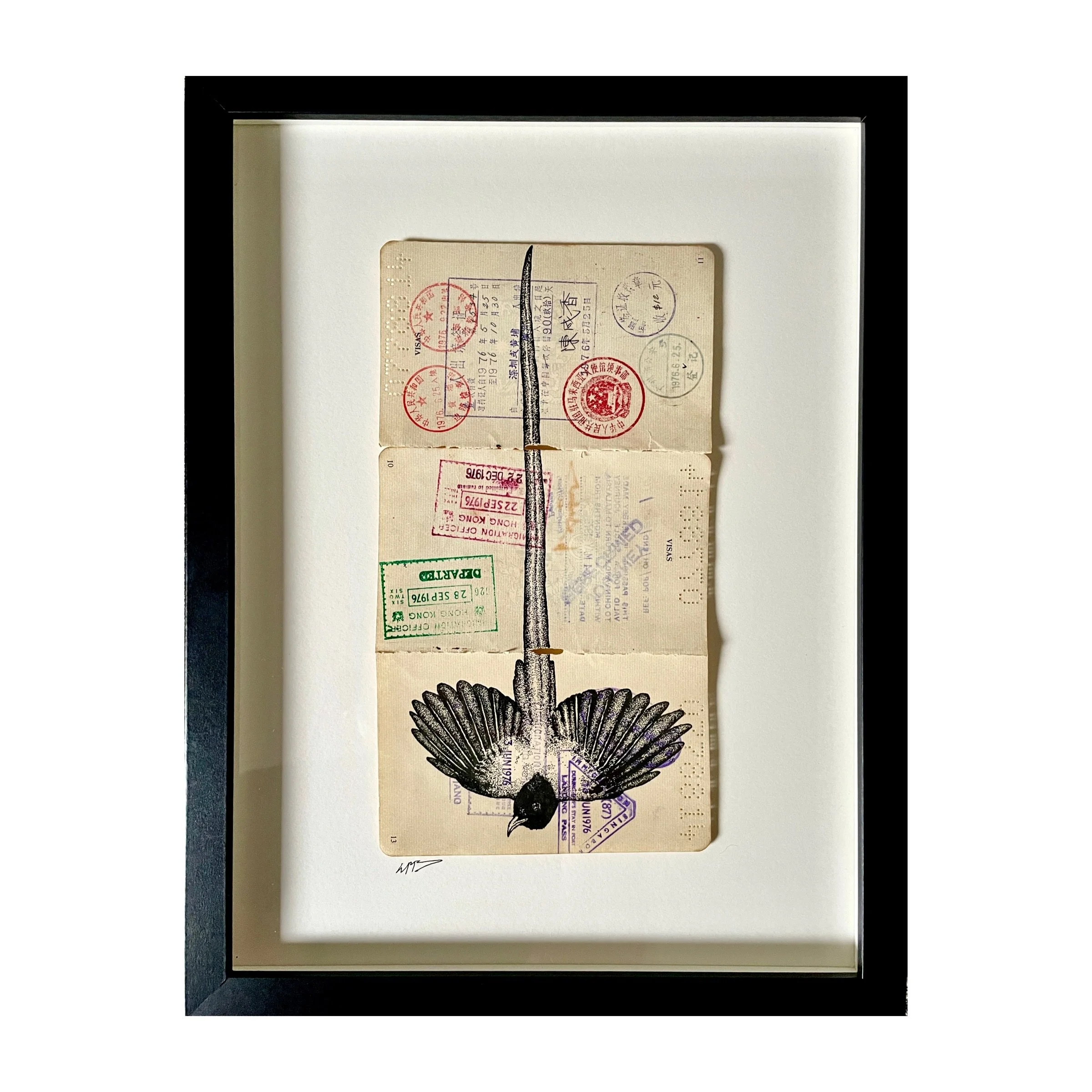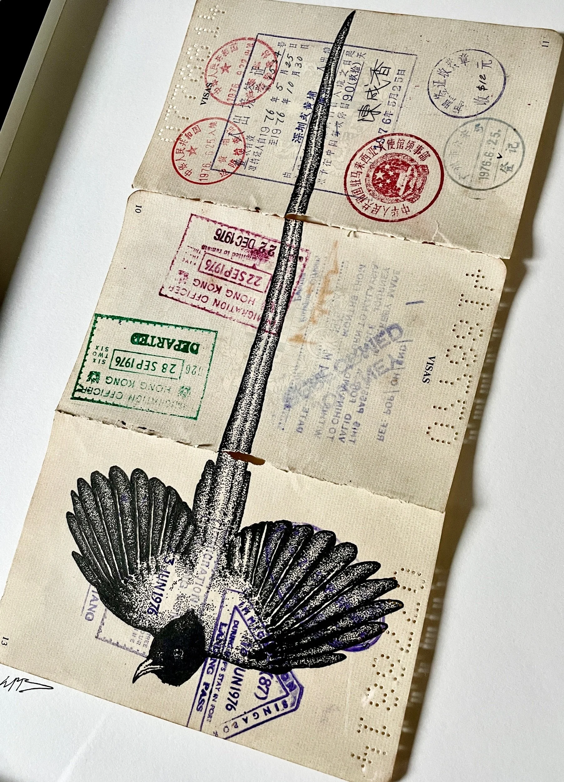 Original pen illustration on three pages from Mdm. Chin Chooi Siow passport. She was born in 1910 in Penang. With a passport full of many travels to Hong Kong and China.