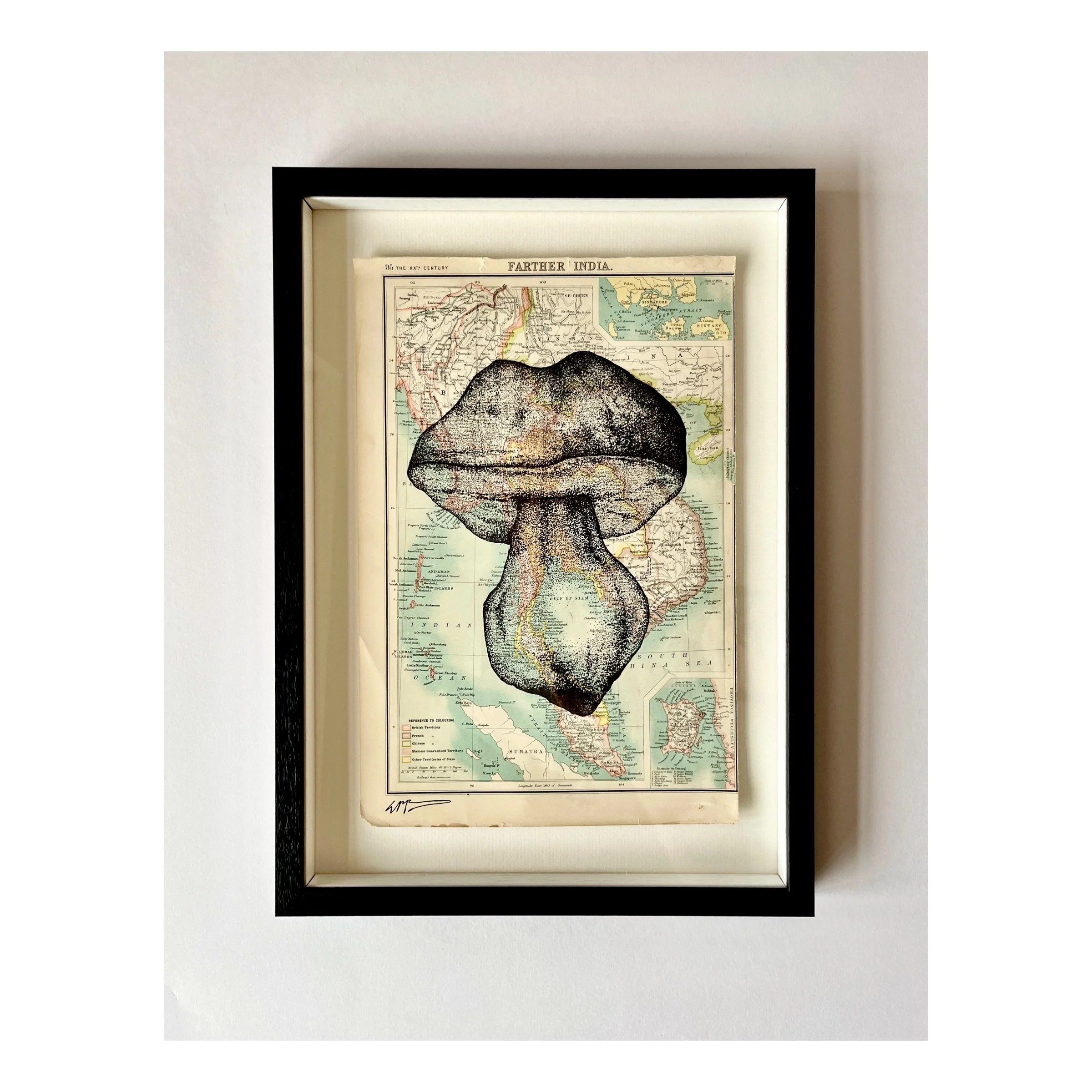 Orginal pen illustration of ‘boletus edulis’ fungi over an antique map of a section of SE Asia dating from 1905. Sourced in East London.