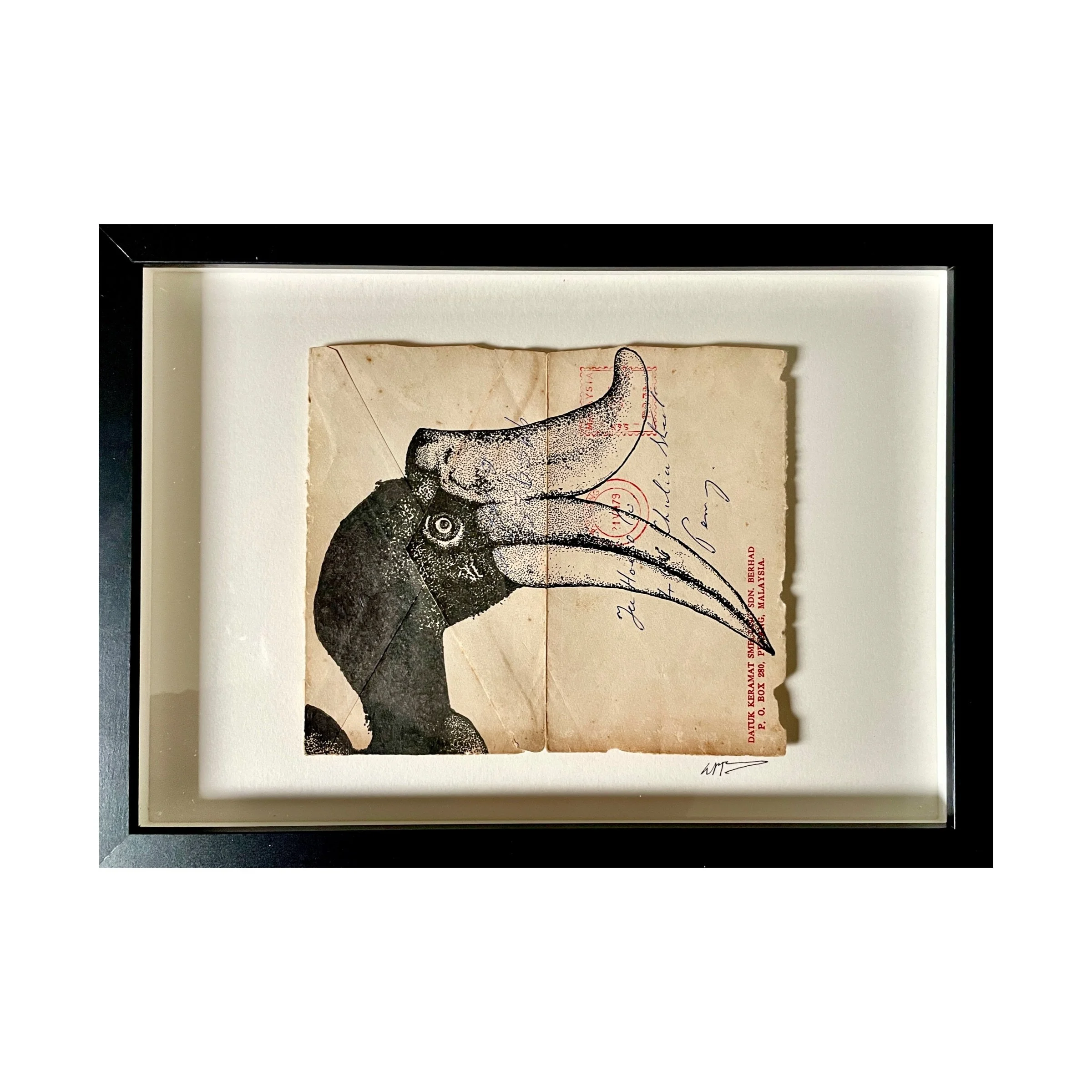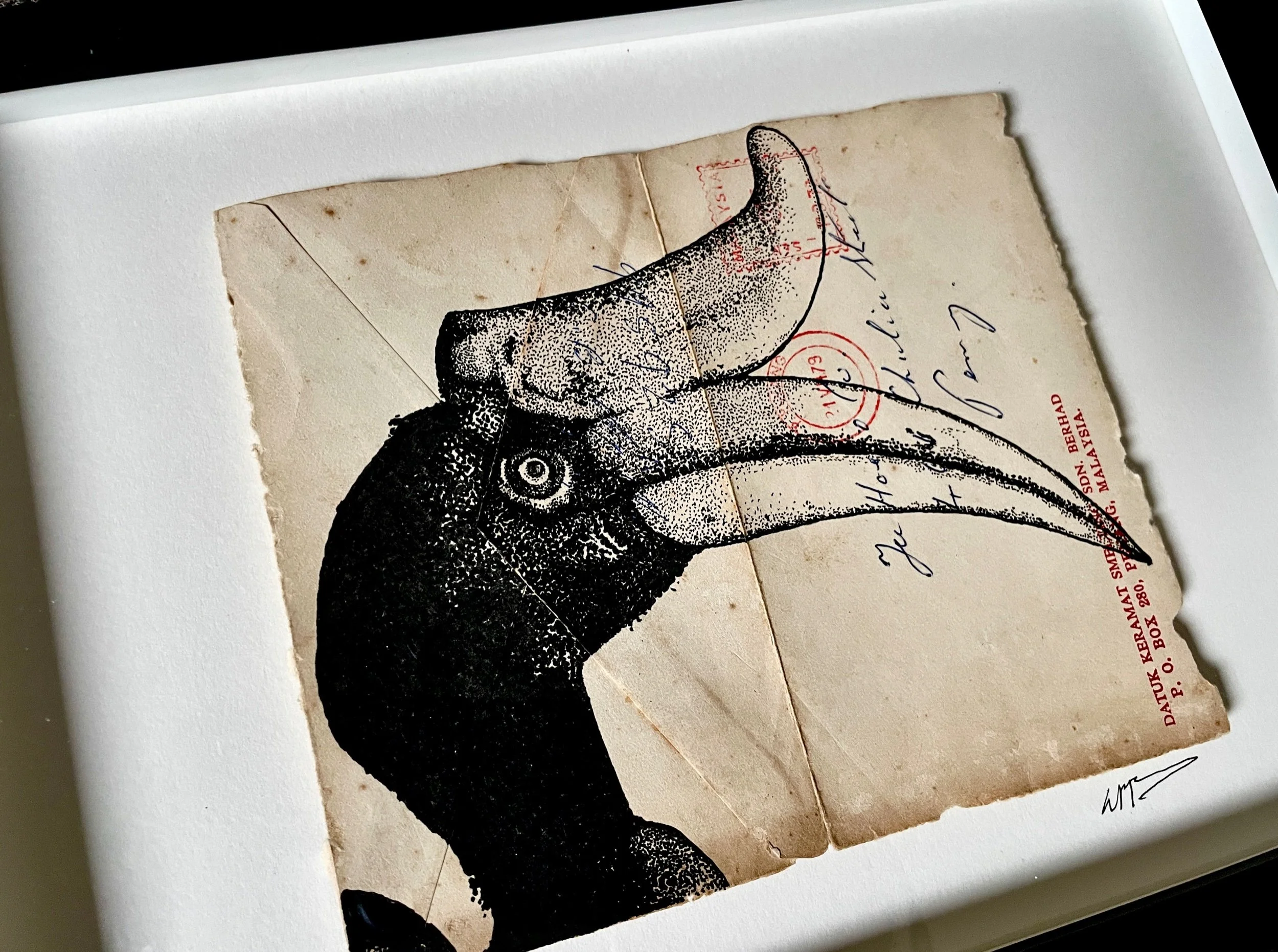 Original pen illustration of a Hornbill. Drawn on a vintage envelope sourced in George Town, Malaysia.